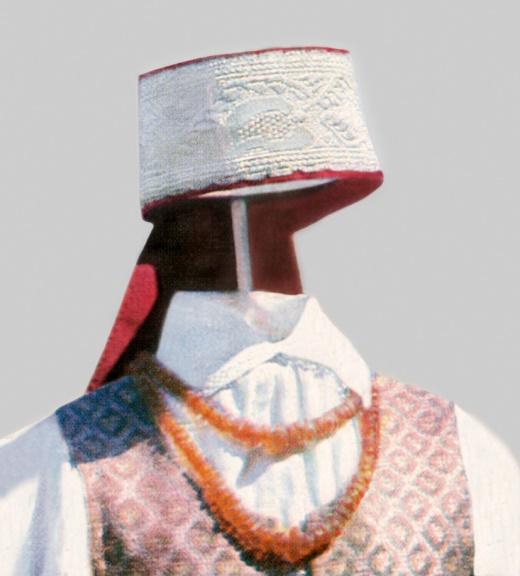 Vyrų tradicinis šventinis kostiumas. Vyrų išeiginiai drabužiai: paprasti namuose austos baltos drobės tunikos kirpimo marškiniai be puošmenų, kelnės, rudinė (sermėga) ir auliniai batai.